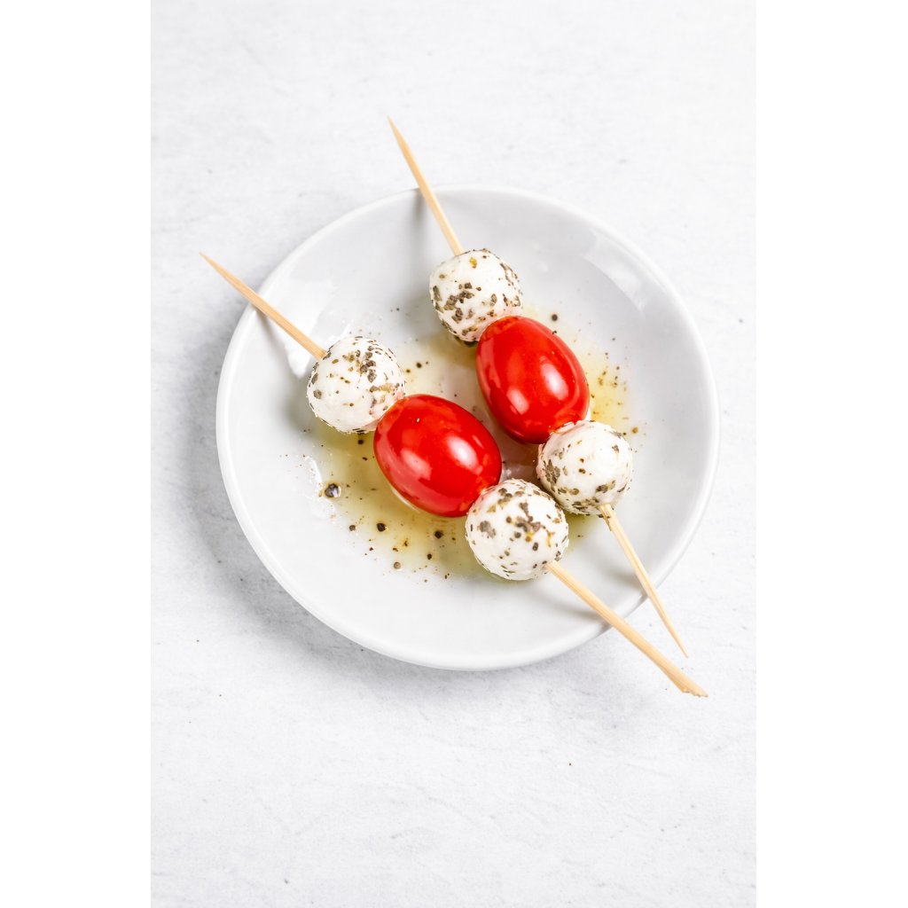 Mozzarela, olivový olej, cherry rajče na párátku.